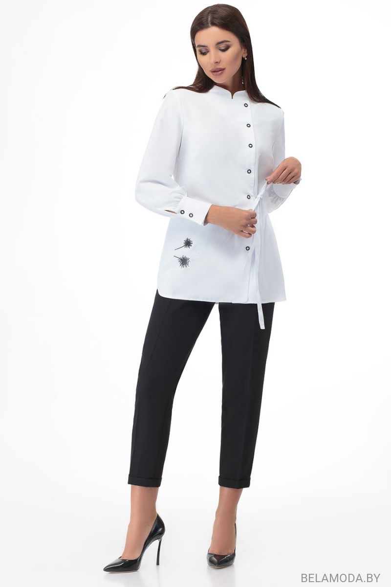 Блузка женская полуприлегающего силуэта, с круглым вырезом горловины, втачным воротником стойкой, со смещённой бортовой застёжкой на петли и пуговицы, с декоративной завязкой на уровне линии талии, идущей из края борта и бокового шва, с нагрудными вытачками. Спинка с талиевыми вытачками. Рукав втачной, длинный, со сборкой по низу и притачной манжетой, с застёжкой на петли и пуговицы. Блузка длиной до уровня бёдер, со слегка скруглённым низом. Отделкой блузки служит аппликация. По воротнику стойке, краю борта, манжетам и поясу проложены отделочные строчки. Длина блузки - 69-72 см Длина рукава - 57-62 см