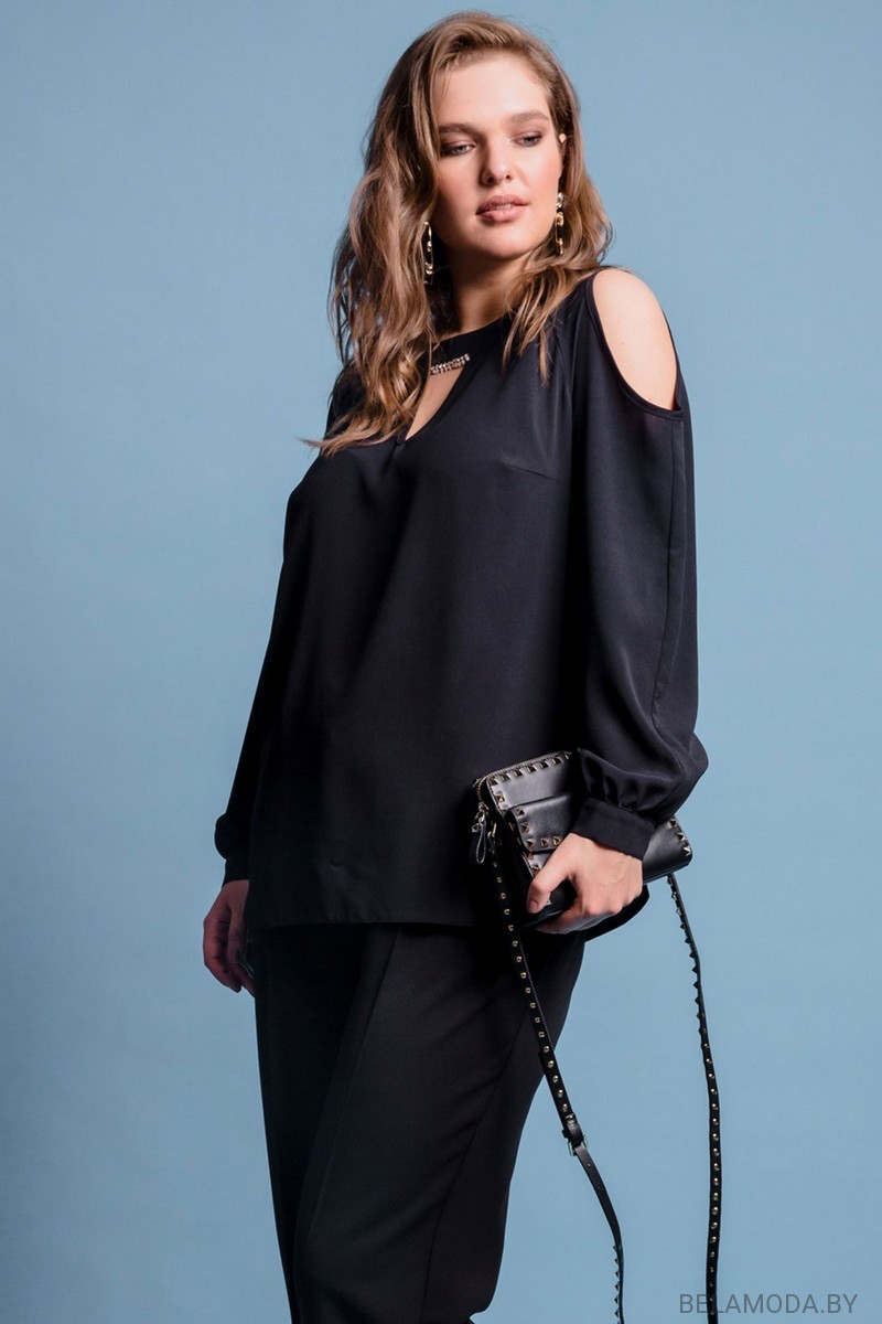 Блуза свободного силуэта с декоративными вырезами по плечам и спереди. Выполнена из блузочной ткани. По горловине спинки разрез 13 см с застёжкой на петли и пуговицы. Рукав реглан, по низу манжет 4 см. По низу боковых швов разрезы 10 см с закруглёнными краями. Блуза декорирована пришивной аппликацией из камешек. Длина изделия 73 см. Длина рукава от горловины 73 см.