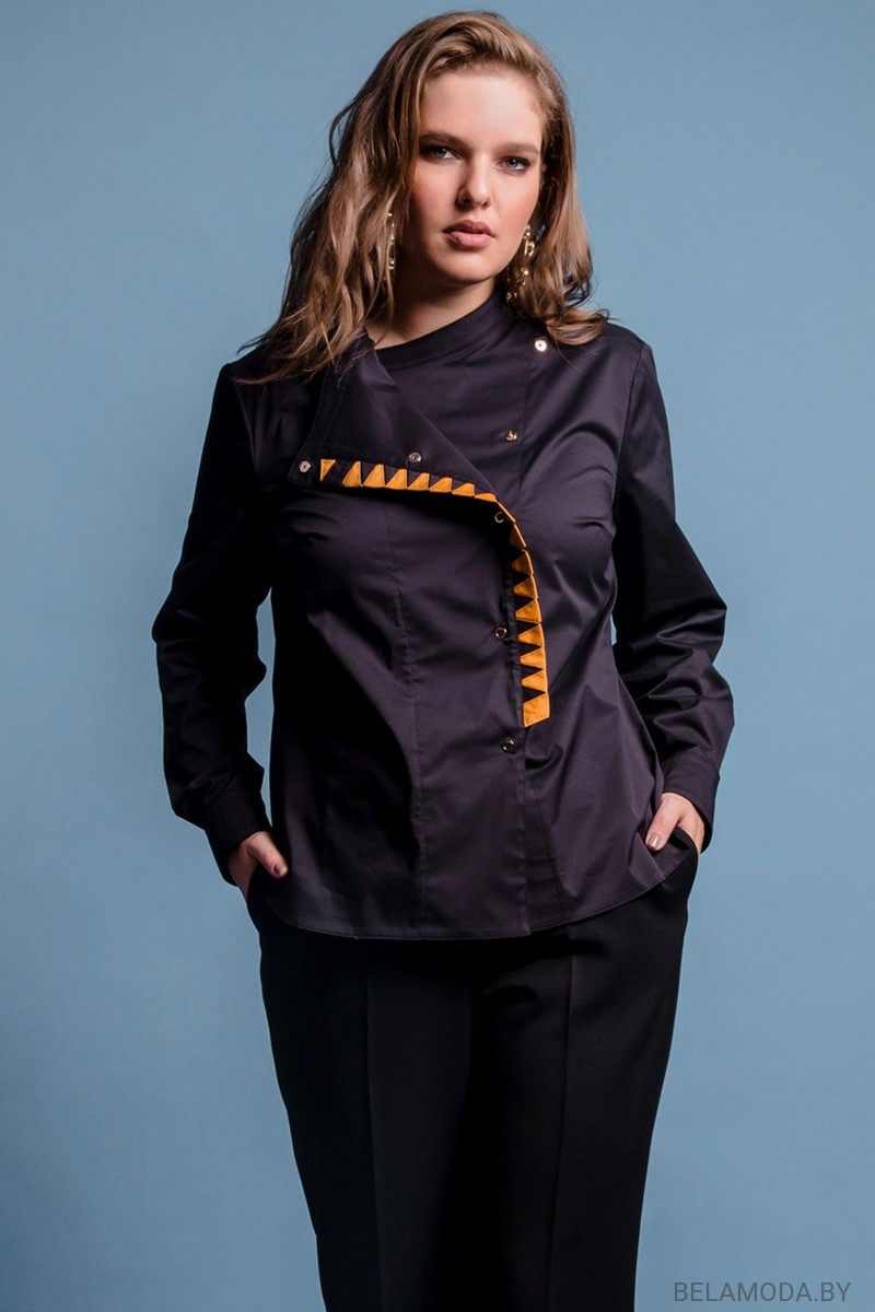 Блузка прямого силуэта, с разрезами по низу боковых швов (края закруглённые). Выполнена из блузочной ткани. Застёжка смещённая по косой, на кнопки. По горловине стойка 2,5 см. Рукав втачной, по низу манжет 6 см с застёжкой на петли и пуговицы. Длина изделия 70 см. Длина рукава 61 см.