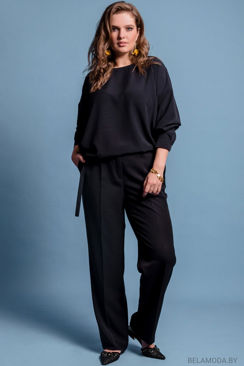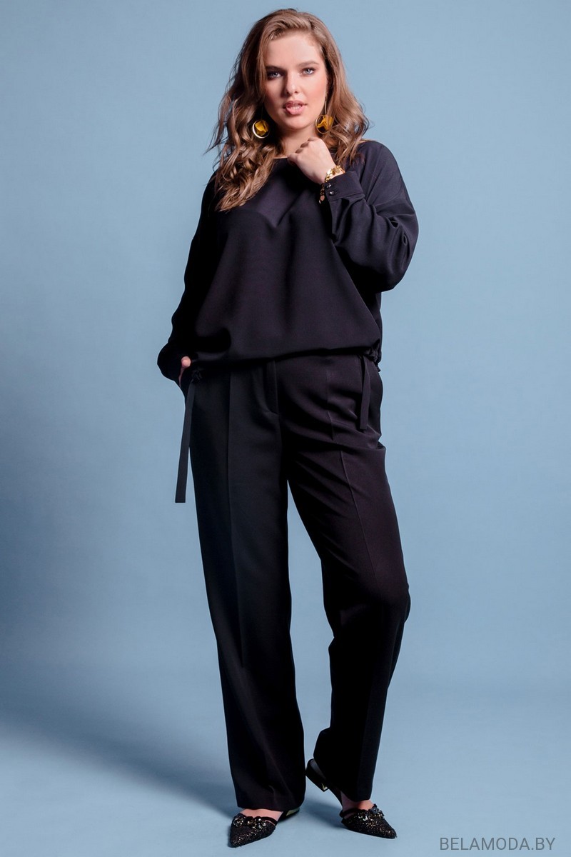 Брюки классические, выполнены из костюмной ткани. Спереди застёжка на тесьму-молнию и петлю и пуговицу. По верхнему срезу пояс 4 см. со шлёвками, по боковым швам вставлена резинка 13 см. По боковым швам вставлены карманы в отрезном бочке. Длина изделия: 109 см.