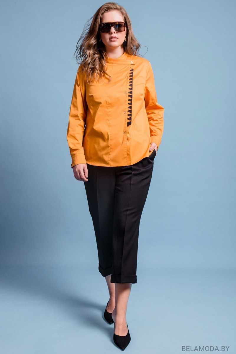 Брюки-кюлоты, с высокой “посадкой”. Выполнены из костюмной ткани, по низу манжет с отворотом 4 см. Застёжка спереди на тесьму-молнию. Верхний срез обработан поясом 4 см. со шлёвками, по боковым швам вставлена резинка 13 см. По боковым швам вставлены карманы в отрезном бочке. Длина брюк: 88 см.