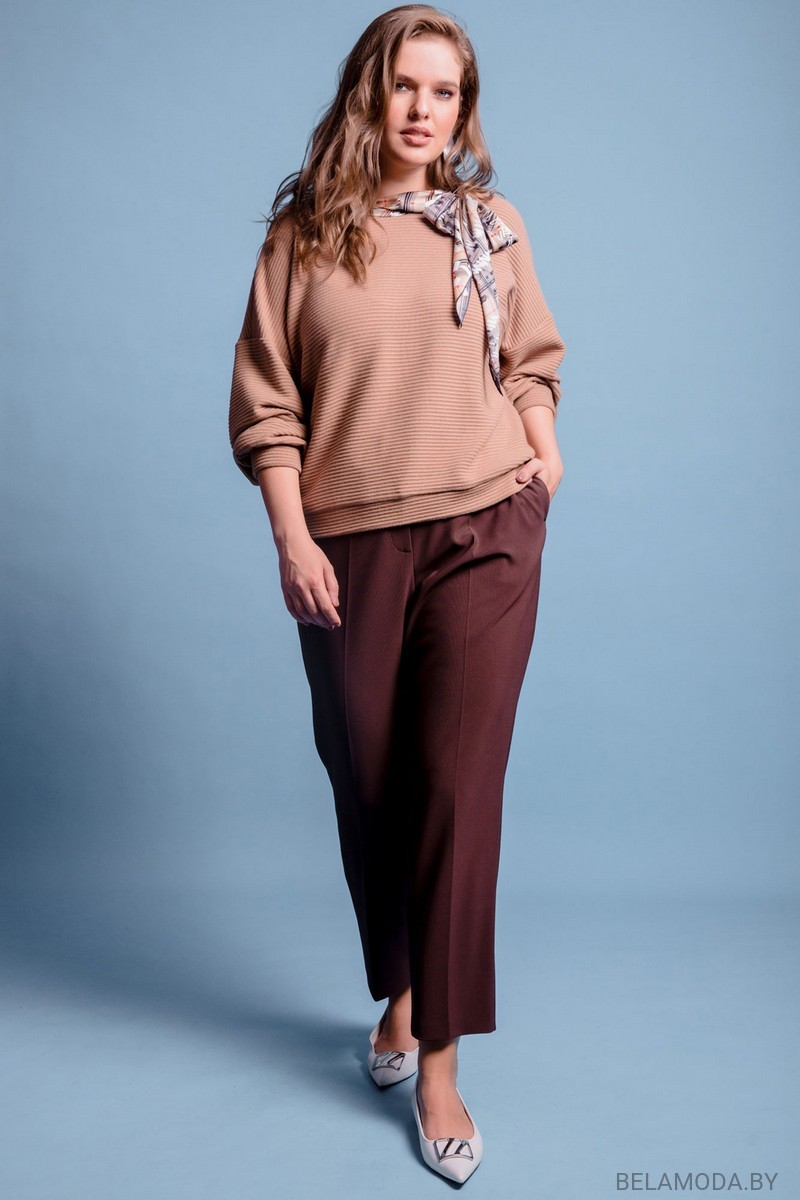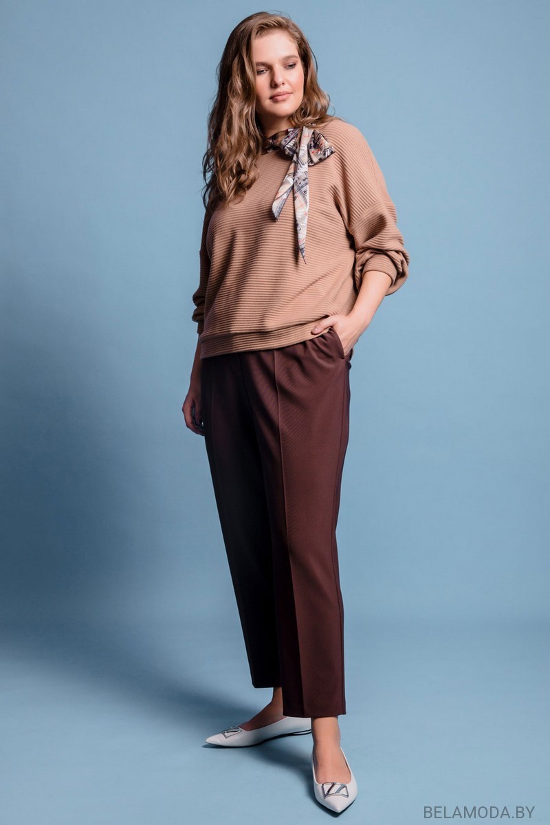 Брюки с высокой “посадкой”, выполнены из трикотажного полотна. Спереди застёжка на тесьму-молнию. Верхний срез обработан поясом со шлёвками, по боковым швам вставлена резинка 15 см. В боковые швы вставлены карманы в отрезном бочке. Длина брюк: 100 см.