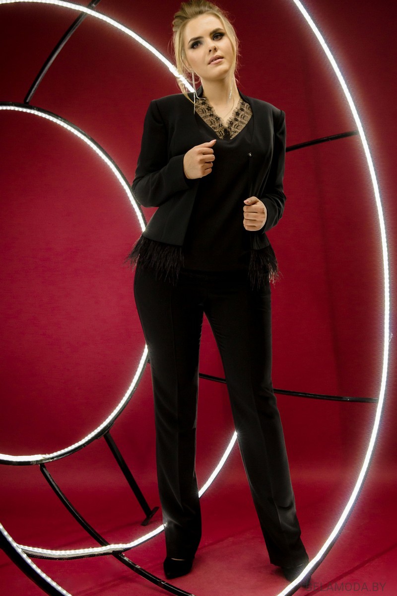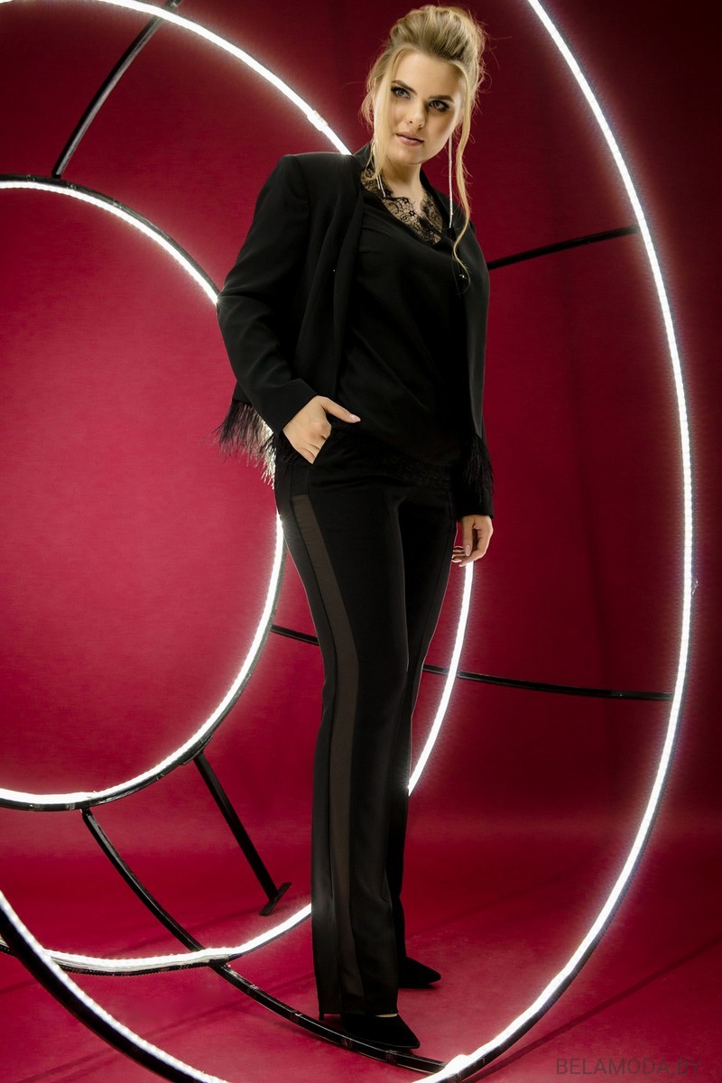 Брюки с высокой “посадкой”. Выполнены из костюмной ткани и декорированы вставкой из шифона по боковому шву (вставка шир 4 см, начинается ниже пояса на 28 см, нога светится). Спереди застёжка на тесьму-молнию. Верхний срез обработан поясом 3,5 см, с шлёвками, по боковым вставлена резинка 15 см. По боковым швам вставлены карманы в отрезном бочке. Длина изделия 108 см. Измерения по готовому изделию 50 р: ОТ 80 см (резинка растягивается до 88 см), ОБ 112 см. 52 р: ОТ 84 см (резинка растягивается до 92 см), ОБ 116 см. 54 р: ОТ 88 см (резинка растягивается до 96 см), ОБ 120 см.