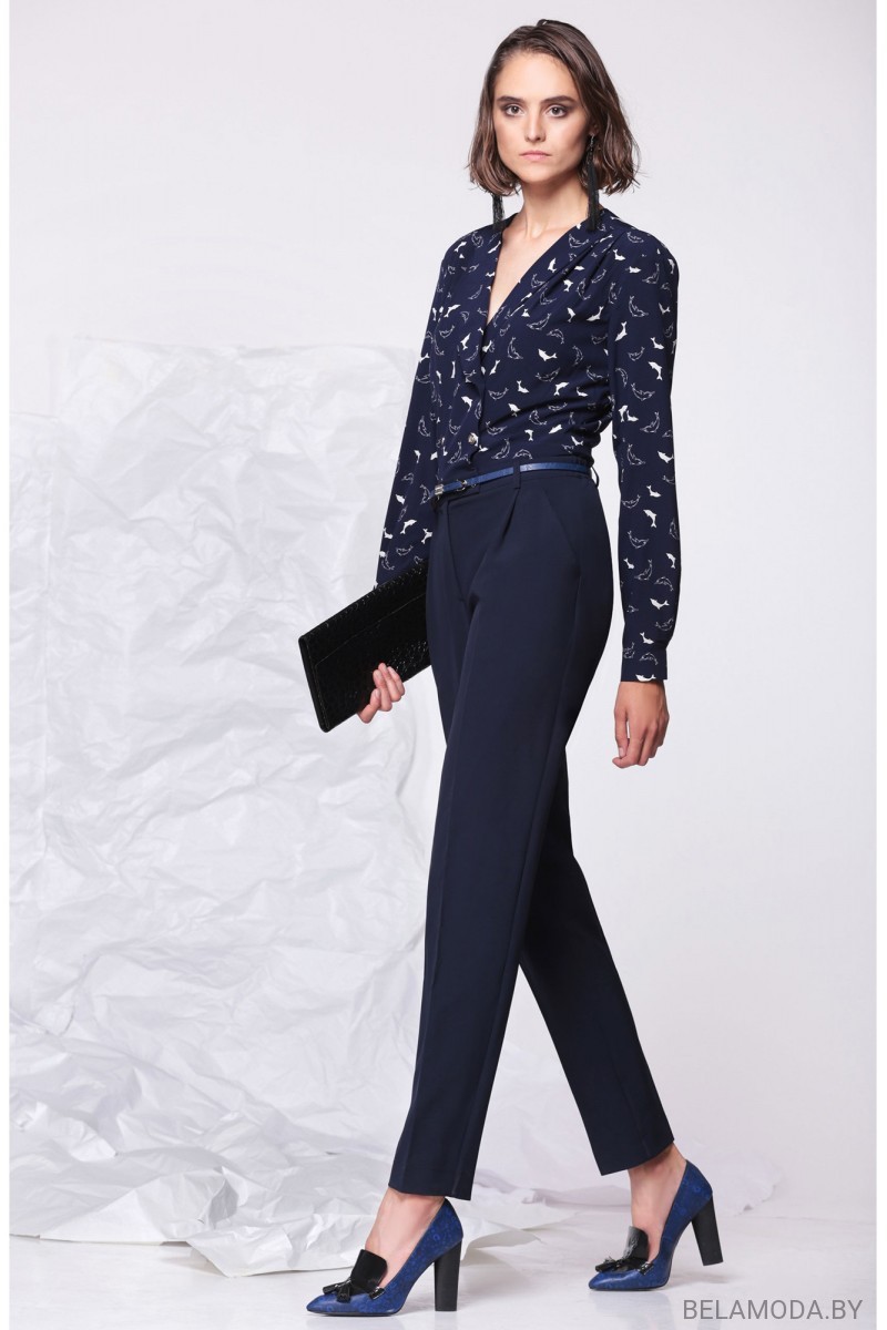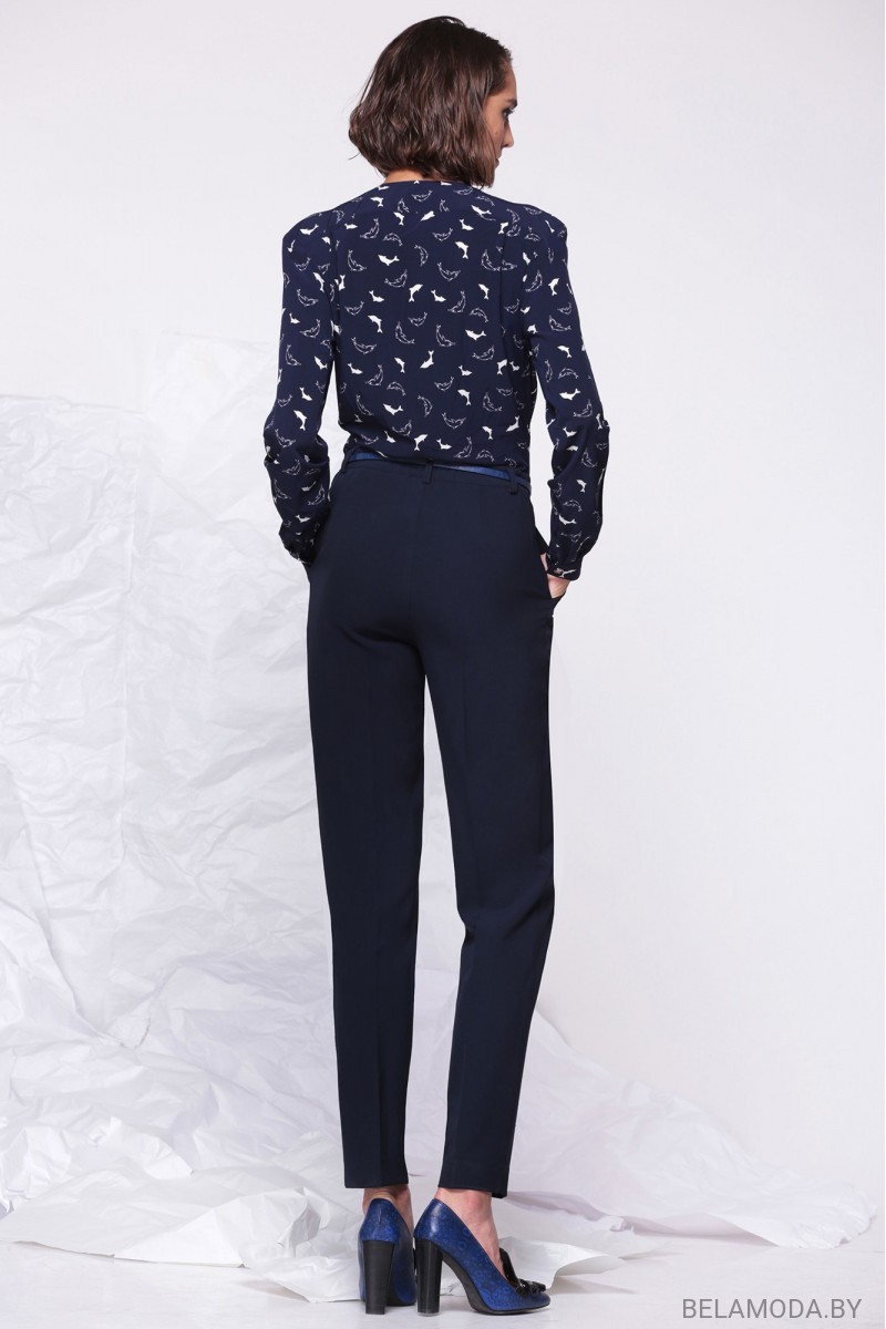 Оригинальный комбинезон полуприлегающего силуэта из двух видов ткани с двубортной застежкой на петли и пуговицы. Вырез горловины V-образный с отложным воротником и лацканами. Спереди лиф с кокетками, цельнокроеными с кокеткой спинки. В шве кокетки закреплен перегиб лацкана и две односторонние складки. Спинка лифа с кокеткой и односторонними складками от шва притачивания кокетки. Спинка цельная, присборенная по линии притачивания к поясу. Нижняя часть комбинезона с притачным поясом и застежкой на петли и пуговицы и гульфик. По поясу 5 настрочных шлевок. Передние нижние части комбинезона с наклонными карманами к боковым швам и односторонними складками от пояса, от складок заутюжены стрелки. Задние нижние части комбинезона с вытачками. По задним половинкам нижней части комбинезона пояс собран на эластичную тесьму. Рукав втачной, длинный, на манжете Длина лифа по спинке: 46,5 см. Длина брюк: 111 см.