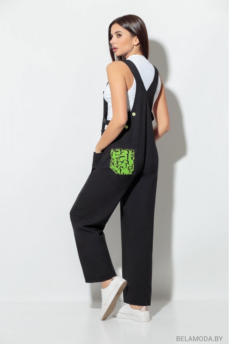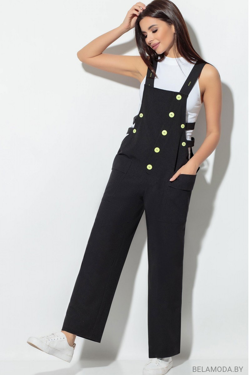 Комбинезон - силуэт oversize, регулируемые бретели на пуговицах. По переду отделочная планка, с пуговицами. Брюки широкие, прямые, с накладными карманами. Длина изделия: 105 см.