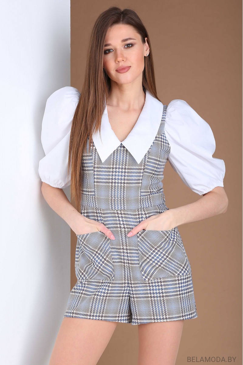 Комбинезон выполнен из текстильной ткани в клетку. Рукава и воротник выполнены из белой хлопкосодержащей ткани. По спинке вставлена молния длиной 50 см. Комбинезон отрезной по талии и на шортах имеются накладные карманы. Длина комбинезона по спинке от верхней точки плеча 79 см. Рукав присборен по окату и внизу на резинке, длина рукава 41 см.