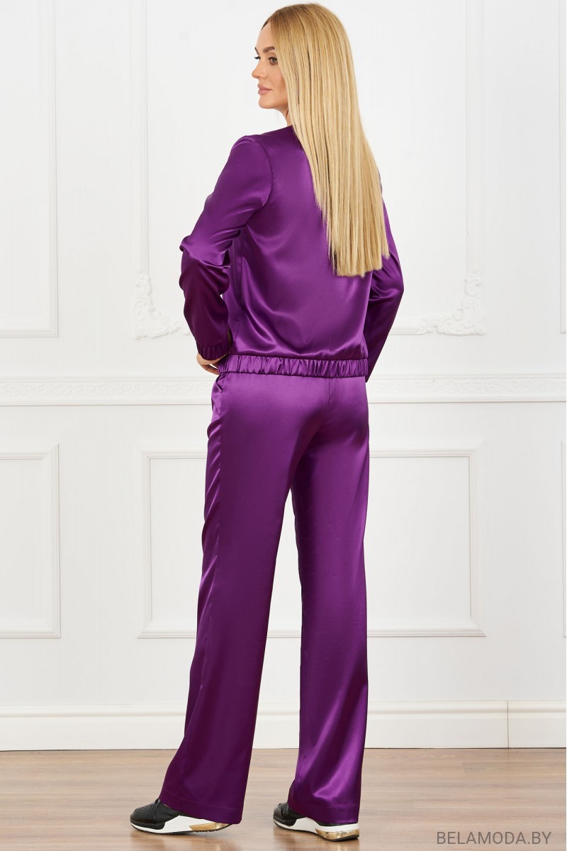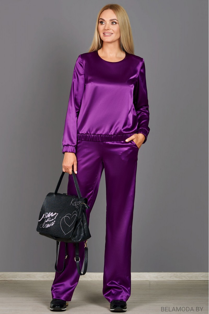 Комплект женский брючный, состоящий из блузы и брюк. Блуза свободного покроя с втачным рукавом на манжете. Брюки свободные на поясе с эластичной тесьмой, с боковыми карманами, без застежки.