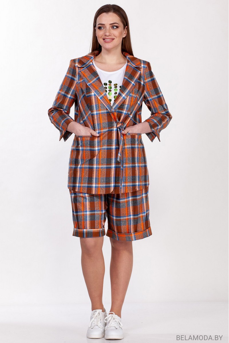 Комплект женский трехпредметный состоит из жакета, шорт и майки. Жакет полуприлегающего силуэта выполнен из костюмной ткани в клетку с добавлением эластана на подкладке. Воротник втачной с отложным лацканом, рукав двухшовный с разрезом, на полочке обработаны функциональные карманы с листочкой. Застегивается на завязки. Шорты с высокой посадкой, выполнены из костюмной ткани в клетку с добавлением спандекса. Пояс без резинки, с застежкой молнией на пуговицу. В боковых швах карманы с листочкой, по низу манжет с отворотом. Майка полуприлегающего силуэта выполнена из вискозы. Горловина круглая с притачной планкой, рукав втачной короткий, полочка украшена аппликацией. Длина жакета - 75 см, длина рукава - 53 см Длина майки - 62 см Длина шорт - 56 см