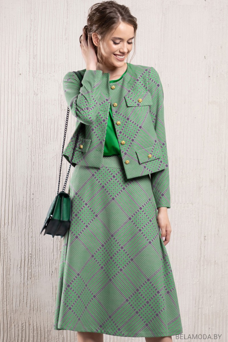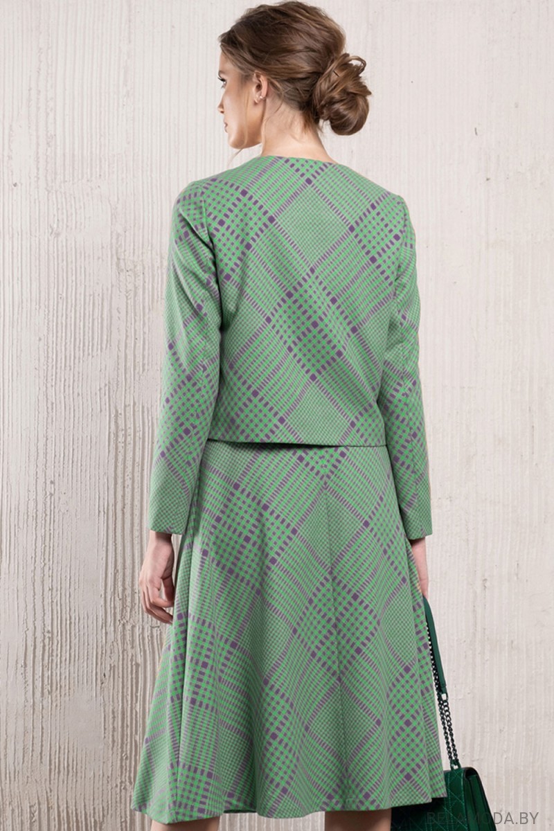 Комплект двойка: жакет+юбка. Ткань костюмно-плательная средней плотности, приятная на ощупь. Жакет укороченный. Изделие на подкладе. Застежка на пуговицы спереди. На переде имитация карманов. Длина жакета в малой базе 51 см, в большой 55 см. Рукав втачной, длина в малой базе 61 см, в большой базе 62 см. Юбка покроя колокол. На подкладе. Застежка на молнию в среднем шве.