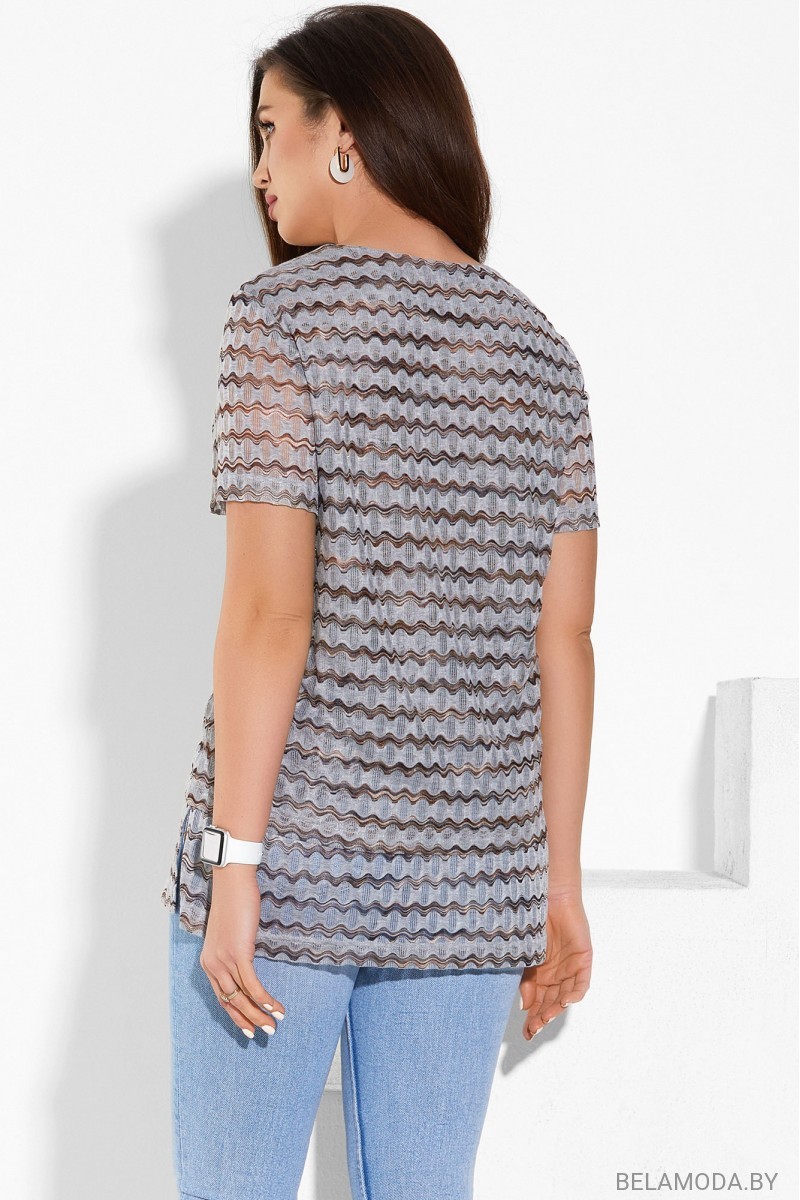 Майка прямого силуэта с V-образным вырезом и дизайнерской печатью из фольги. Перед оформлен нагрудными вытачками из проймы. Нижняя майка удлиненная с разрезами по бокам. Спинка цельная. Перед и спинка двойные с наложением. Рукав втачной. Длина спинки 72 см, рукав 21,5 см. Ширина плеча 12 см.