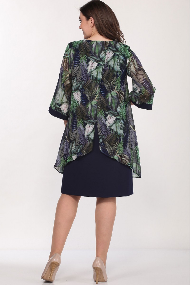 Платье прямого силуэта, с круглым вырезом горловины, двухслойное. Рукав втачной, одношовный, длиной 3/4, по низу обработан притачной манжетой. Размеры 48-52: Длина платья 94 см, длина рукава 46 см. Размеры 54-58 : Длина платья 96 см, длина рукава 47 см.