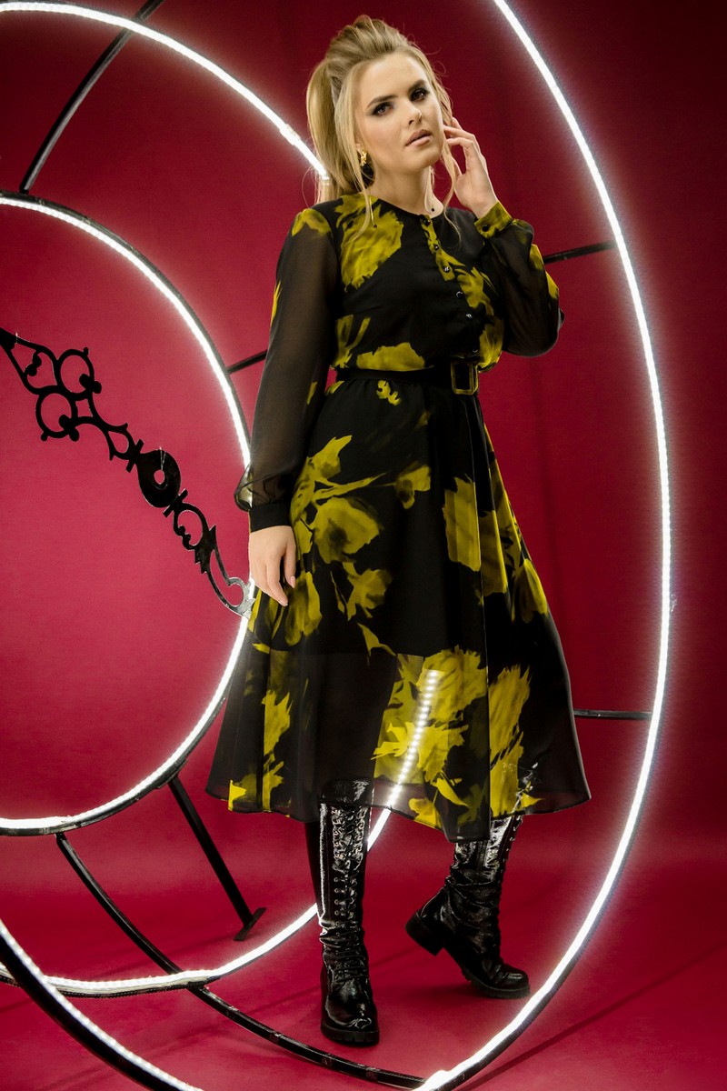 Платье свободное, по талии присборено эластичной тесьмой (резинкой). Выполнено из шифона, на подкладке. Спереди по верхней части планка с застёжкой на петли и пуговицы. Рукав втачной, по низу манжет 4 см. В комплекте пояс из основной ткани. Длина изделия 124 см. Длина рукава 59 см. Измерения по готовому изделию 54 р: ОГ 114 см, ОТ 78 см (резинка растягивается до 110 см), ОБ 168 см. 56 р: ОГ 118 см, ОТ 78 см (резинка растягивается до 110 см), ОБ 172 см. 58 р: ОГ 122 см, ОТ 82 см (резинка растягивается до 110 см), ОБ 176 см.