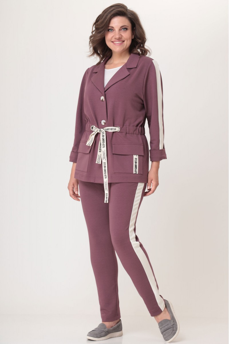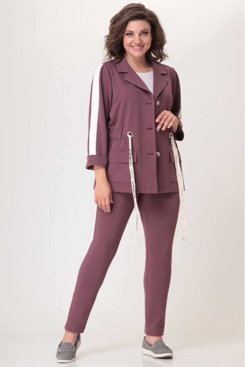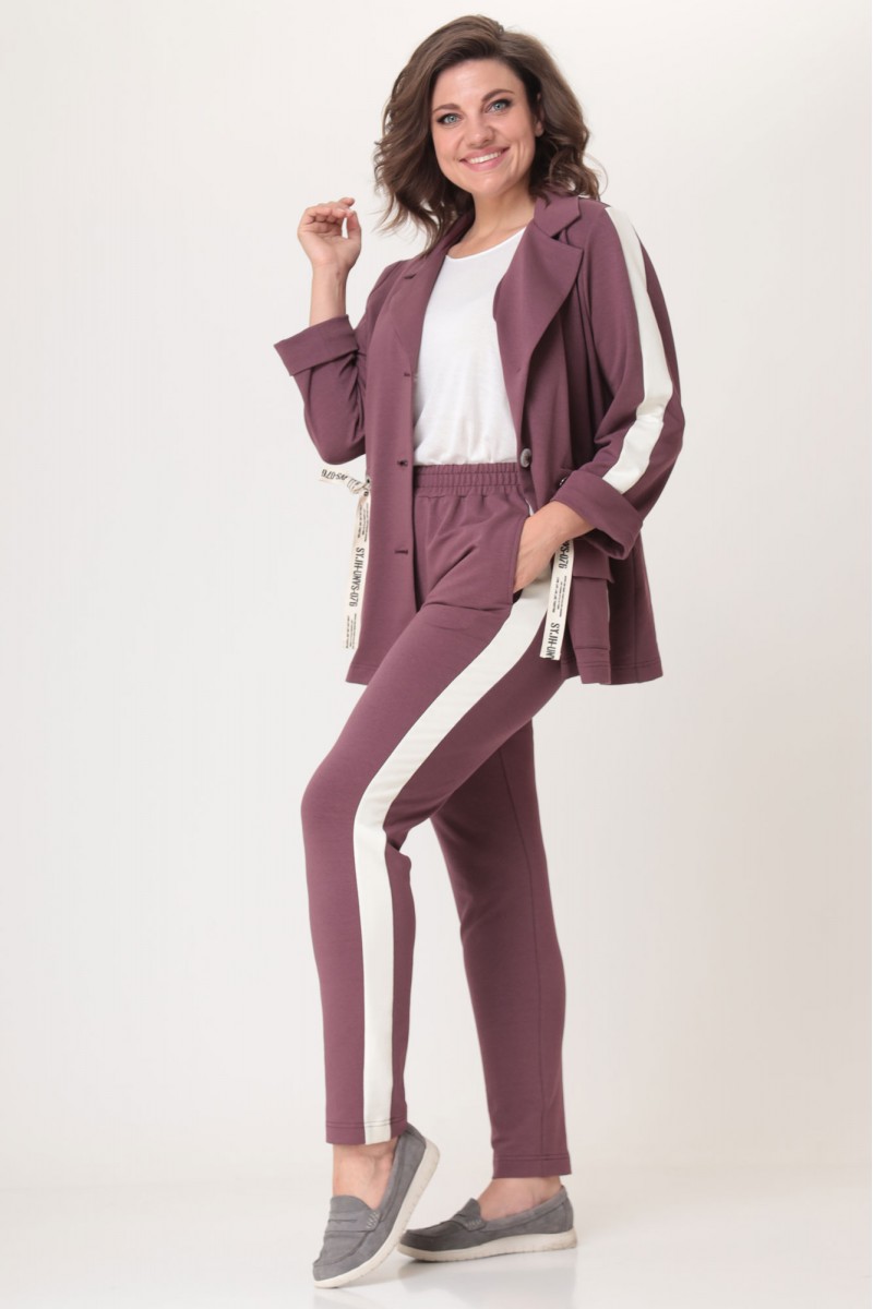 Стильный костюм в стиле спорт-шик состоит из двух предметов: жакета и брюк. Выполнена модель из трикотажного полотна футер с содержанием хлопка и эластана. Жакет свободного прямого силуэта с притачным воротником и лацканами пиджачного типа, по переду центральная застёжка на три петли-пуговицы, по линии талии настрочена внутренняя кулиска с втянутой эластичной резинкой и декоративной тесьмой, протянутой через люверсы, которая выполняет функцию пояса. От боковых швов по переду жакета расположены накладные карманы с отложными клапанами. На карманах есть элементы декора. Спинка цельная. Рукав втачной, длиной 7/8, по центру рукава деталь в виде лампаса из отделочной ткани, внизу мягкий отложной манжет. Брюки прямые, в меру свободные, чуть заужены к низу, дополнены боковыми карманами по переду. Пояс притачной с эластичной тесьмой-резинкой. По боковым швам брюк вставлены лампасы из отделочной ткани.