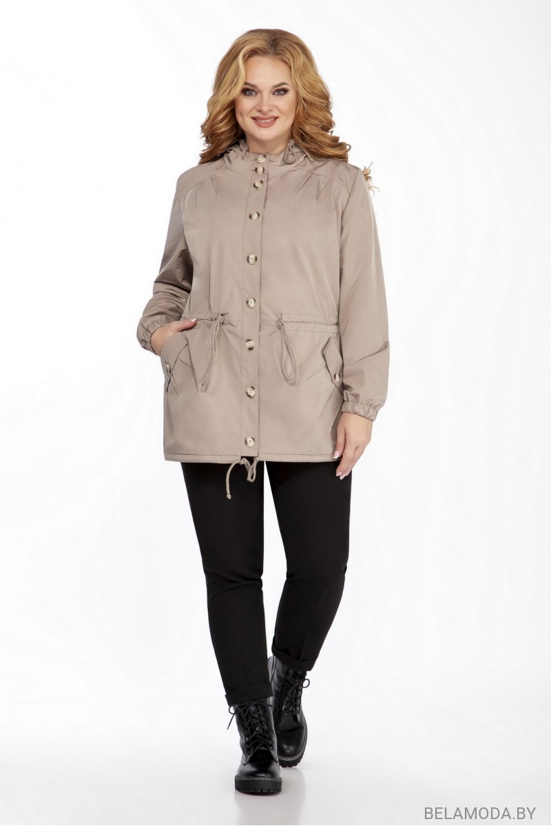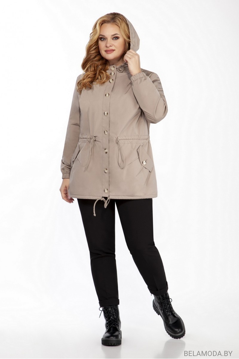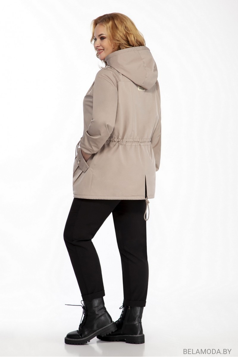 Куртка женская удлиненная, выполнена из плотной плащевой ткани. Куртка полностью на подкладке. Воротник - стойка на пуговицах и капюшон с кулиской и шнуром, застежка по планке на пуговицы. Впереди кокетка и декор складочками, на талии две кулиски со шнуром. Внутренние карманы с клапанами и пуговицами + декор складочками. По спинке кокетка с аппликацией, центральный шов с разрезом, по талии две кулиски. Низ куртки оформлен кулиской со шнуромДлина куртки сзади по спинке от плечевого шва 76 см, длина рукава 63см.. Рукав длинный, манжета на резинке. Куртка модная легкая влаго- и ветронипроницаемая и очень комфортная