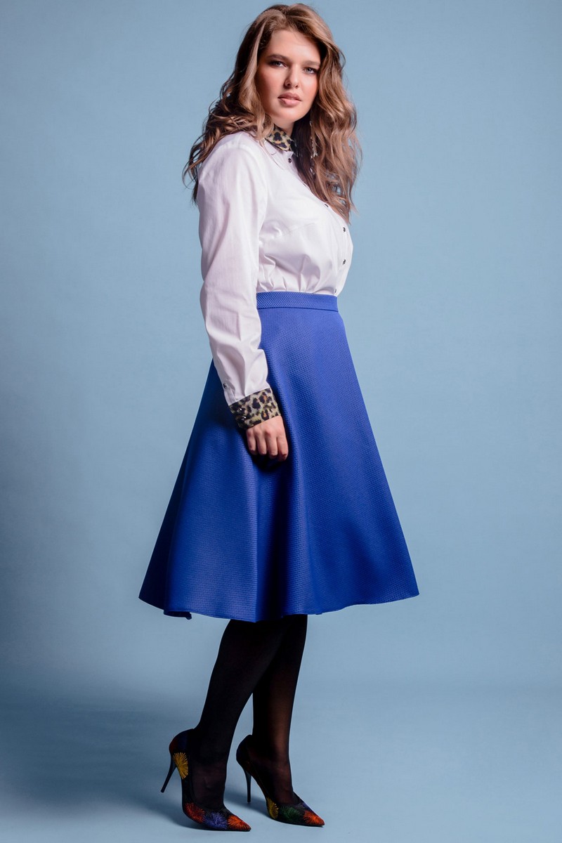 Юбка выполнена из легкой плательной ткани, на подкладке, расклешенная. Застёжка на потайную тесьму-молнию в левом боковом шве. По верхнему срезу пояс 3.5 см, по спинке вставлена эластичная тесьма (резинка). Длина юбки: 71 см.